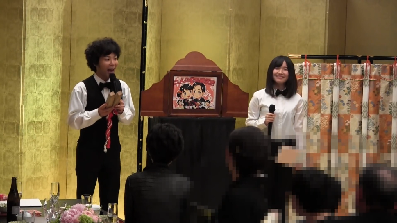 Nos casamentos, Kubotenki e seus colegas contam a história do casal com um kamishibai personalizado.